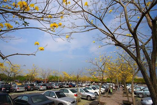 黃金風鈴木,為巴西國花,是一種會隨著四季變化而更換風貌的樹。春天枝條葉疏,開著漂亮的黃花;夏天長葉結果莢,幸運的話,還能見到翅果紛飛的驚喜;秋天枝葉繁盛,一片綠的景象;冬天枯枝落葉,呈現出淒涼之美。春、夏、秋、冬,則展現出不同的風味。期待每年三月黃花盛開,邀你共賞。